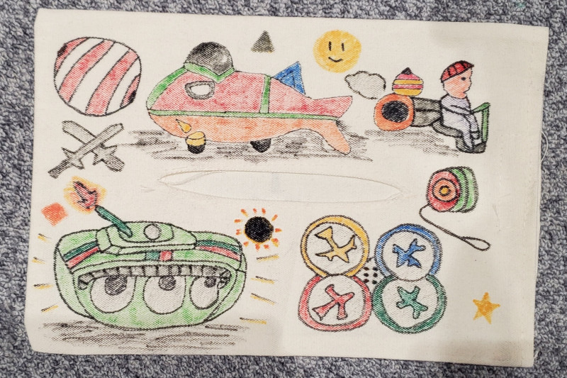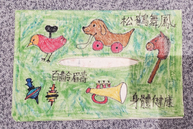 當我設計這個紙巾盒套的時候,我想到的是外公。幾年前,外公突然臥病在床,也漸漸失去了笑容,但是每次見到我的時候他都笑得格外開心。我把小時候外公送給我的小玩具畫出來,希望把這份記憶留在畫布上,也希望收到這個紙巾盒套的爺爺奶奶也能健健康康,開開心心。