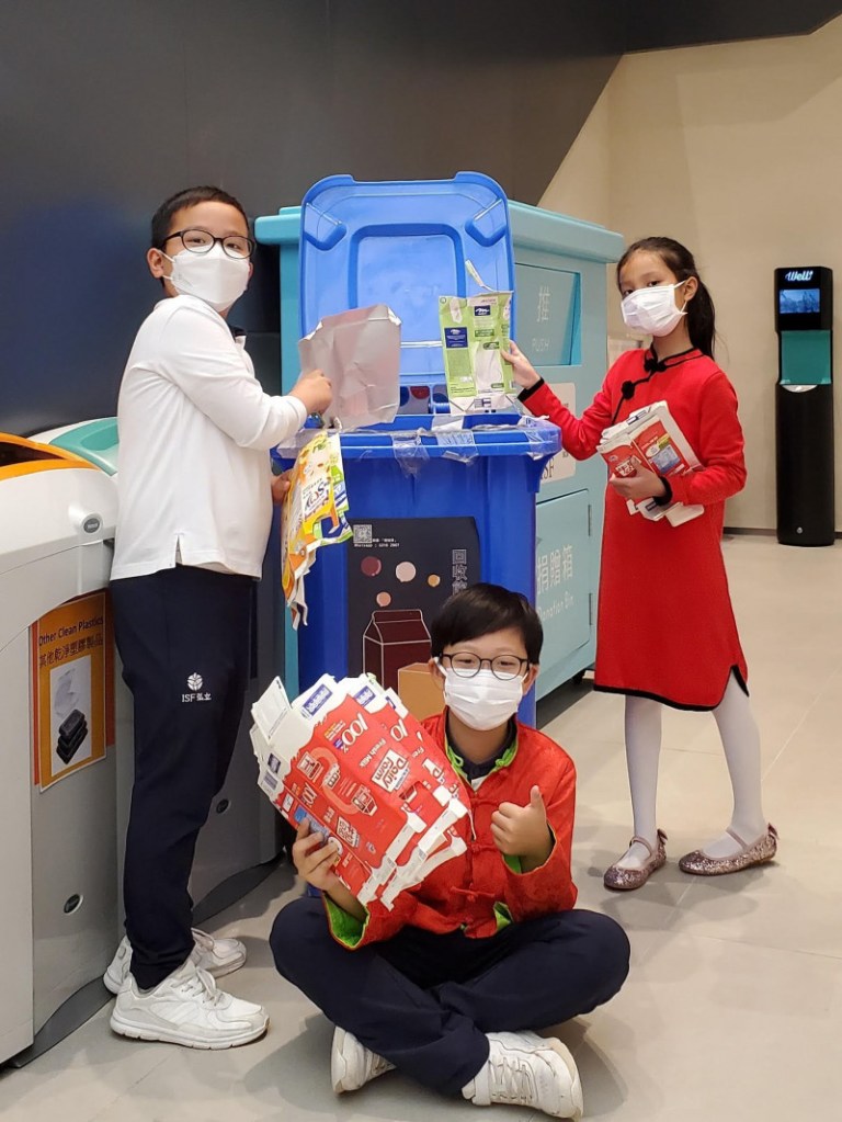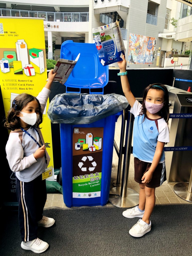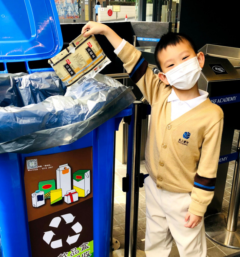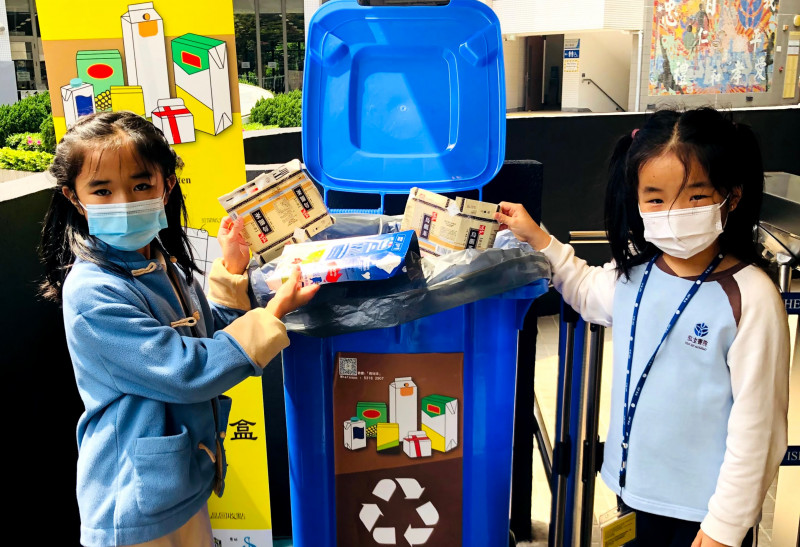 紙包飲品盒回收行動:我們現正試行一個果汁盒和牛奶盒(任何盒裝飲料)的收集活動。兩個印有藍色標記的飲品盒回收箱,將會分別擺放在小學閘口及高錕廣場。飲品盒是難以生物降解的物料,並且是飲料及其他液體的主要包裝方式。我們鼓勵學生和家庭善用這些盒子。學生只需將空盒剪開、沖洗妥當,便可以將它們帶回學校回收。收集到的飲品盒將會送往元朗的紙包飲品盒回收漿廠「Mil Mill喵坊」加工成紙漿,然後用作製造紙箱、硬皮圖書的封面和貓砂。請點擊這裡觀看有關如何回收飲品盒的視頻。