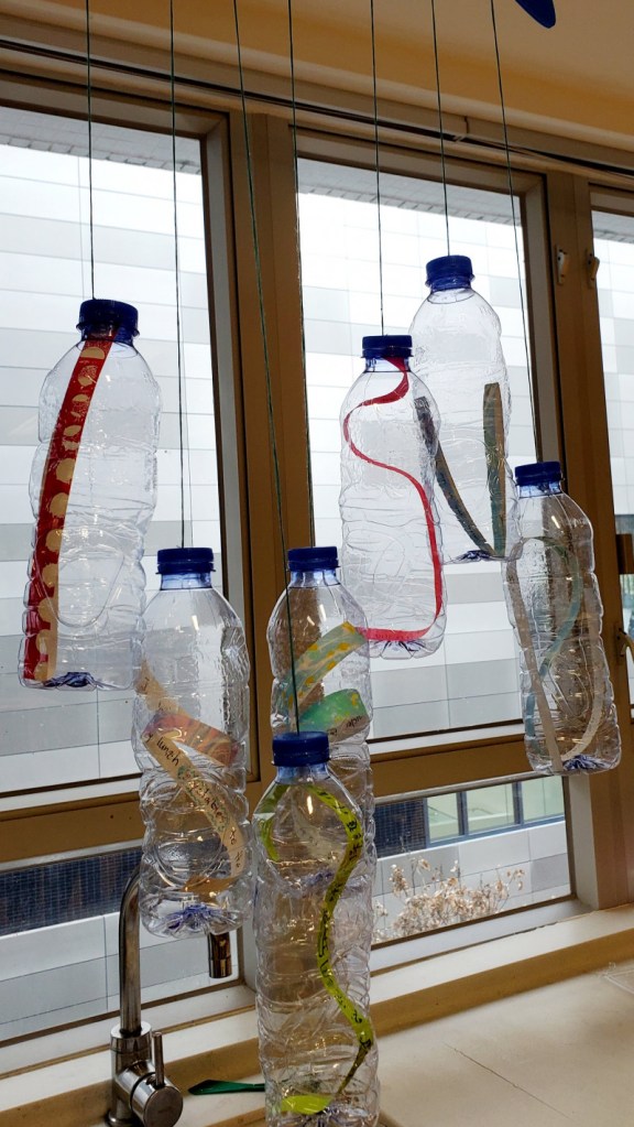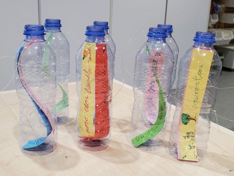 Over 400 plastic bottles destined to the recycling bins were upcycled into a piece of reflective work. Students were invited to create a Message-In-A-Bottle which included one wish for the planet and one action to help reduce their own carbon footprint. Their little paper strips made for sweet reading and showed awareness that they are future stewards of the planet.