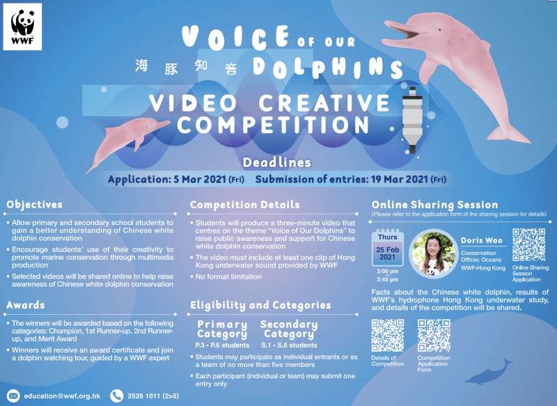 召集所有創意視頻製作人!世界自然基金會現正舉辦視頻比賽,以提高人們對海豚保育的意識。詳情請參閱這裡。謹記請將視頻直接提交給主辦機構。另外,亦請將視頻的鏈結電郵給Monica Lo老師(mlo@isf.edu.hk),以便在社區和服務博客上分享你的視頻。截止日期:2021年3月19日(星期五)。