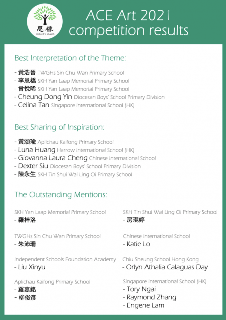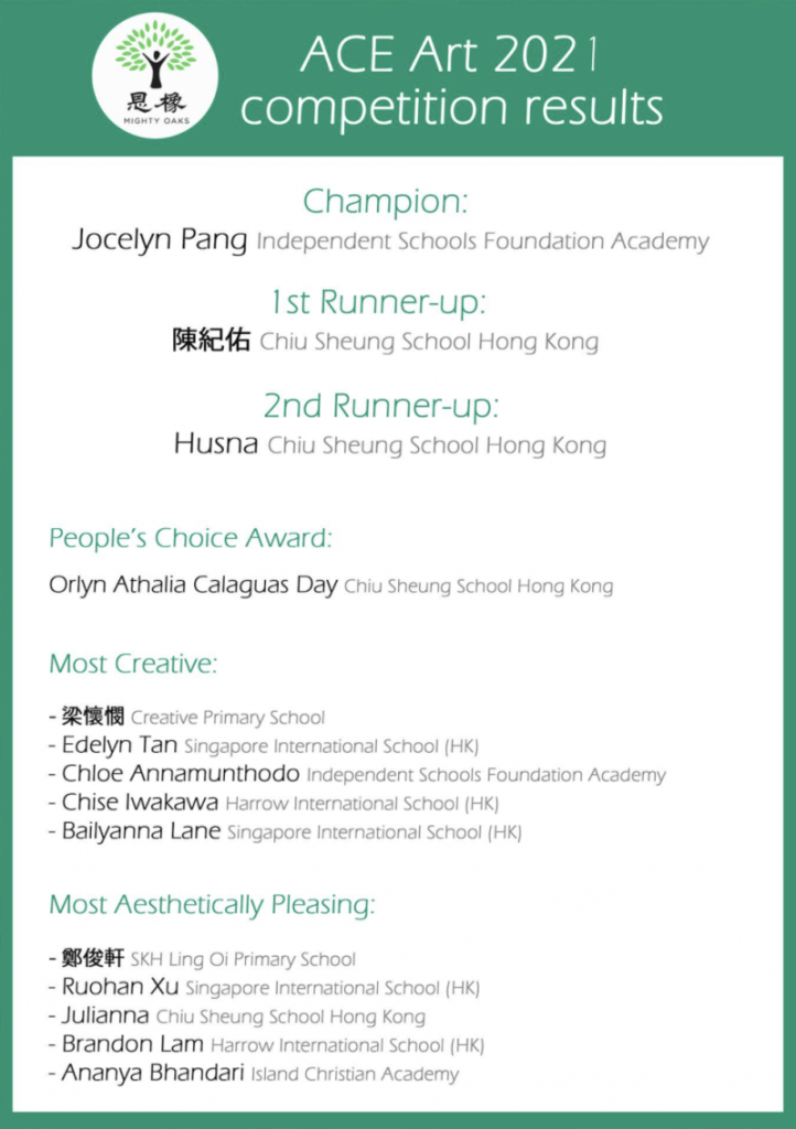 You can participate in the People’s Choice Award hosted on Mighty Oak’s Facebook page. With your parents, you can cast your vote for your favourite design and support all the young artists. Click HERE to vote before March 8th.