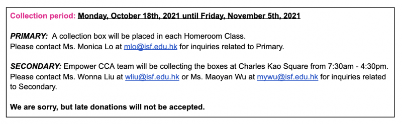 A collection box will be available in Homeroom classrooms for students to drop off their donations. Donations will go to the People’s Food Bank of St. James’ Settlement. More information about this organization can be found HERE. Late donations will not be accepted.