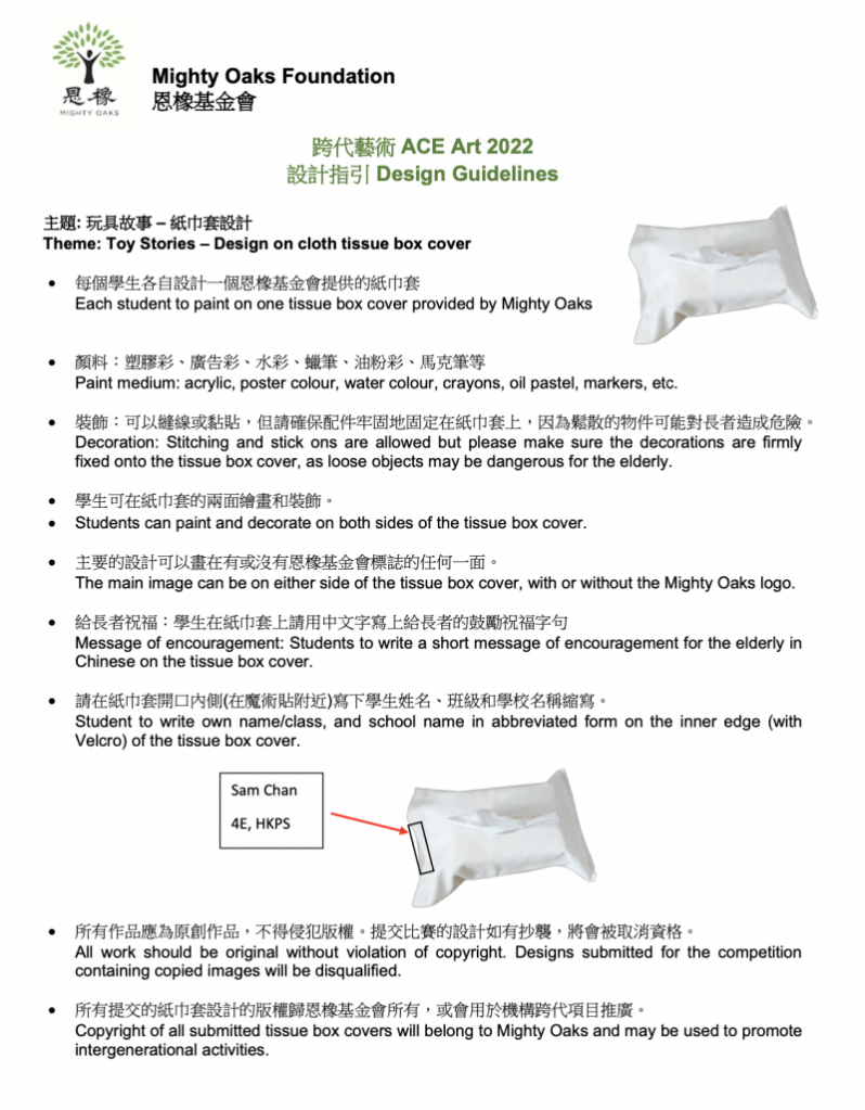 Grade 5s! Don’t forget to turn in your decorated Mighty Oaks Elderly Appreciation Tote Bag competition by 20NOV. Finalists will enter the online voting competition. Drop them off at the Primary Office. **Don’t forget** to draw stamp frame around your work and to include a warm message of blessing (in Chinese) for the elderly.