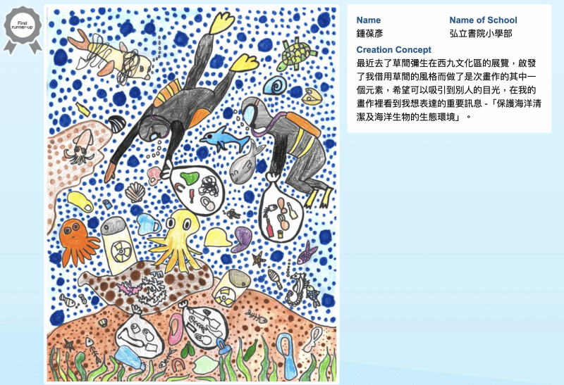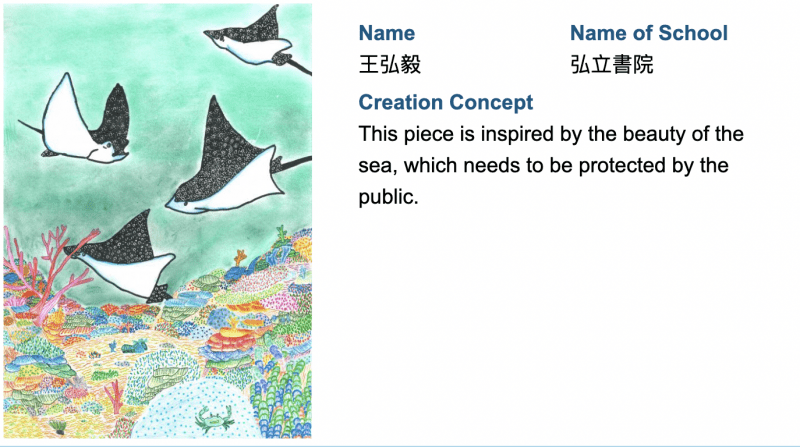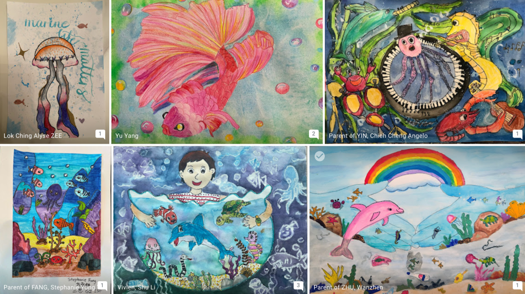 There were 88 participants from FY to Grade 8 in this art competition to raise awareness of the beauty of marine life and the importance of protecting our planet. The following artwork has been shortlisted for the next selection phase. The artworks listed from left to right are from: Nathan Lee 1De, Yanue Lau 3Ren, Au Sing Ling Raffaella 2Li, Puter Kang 6Wood1, Gordon Tang 1Ai, and Ashley Chung 3Li, and Claire Wong 5Z. Congratulations and Good luck! Thank you to all those who participated!