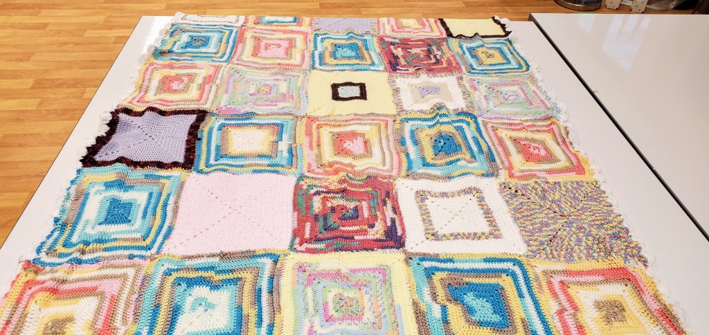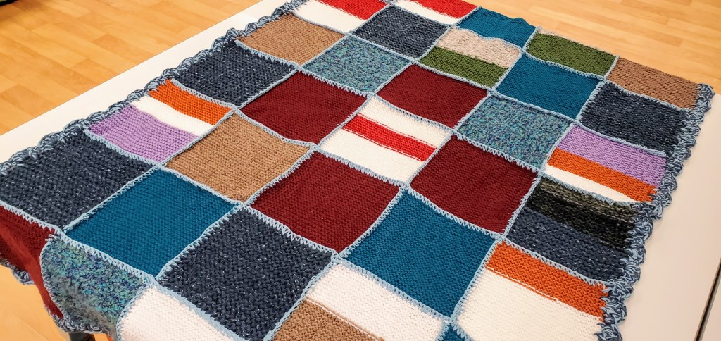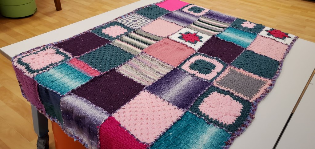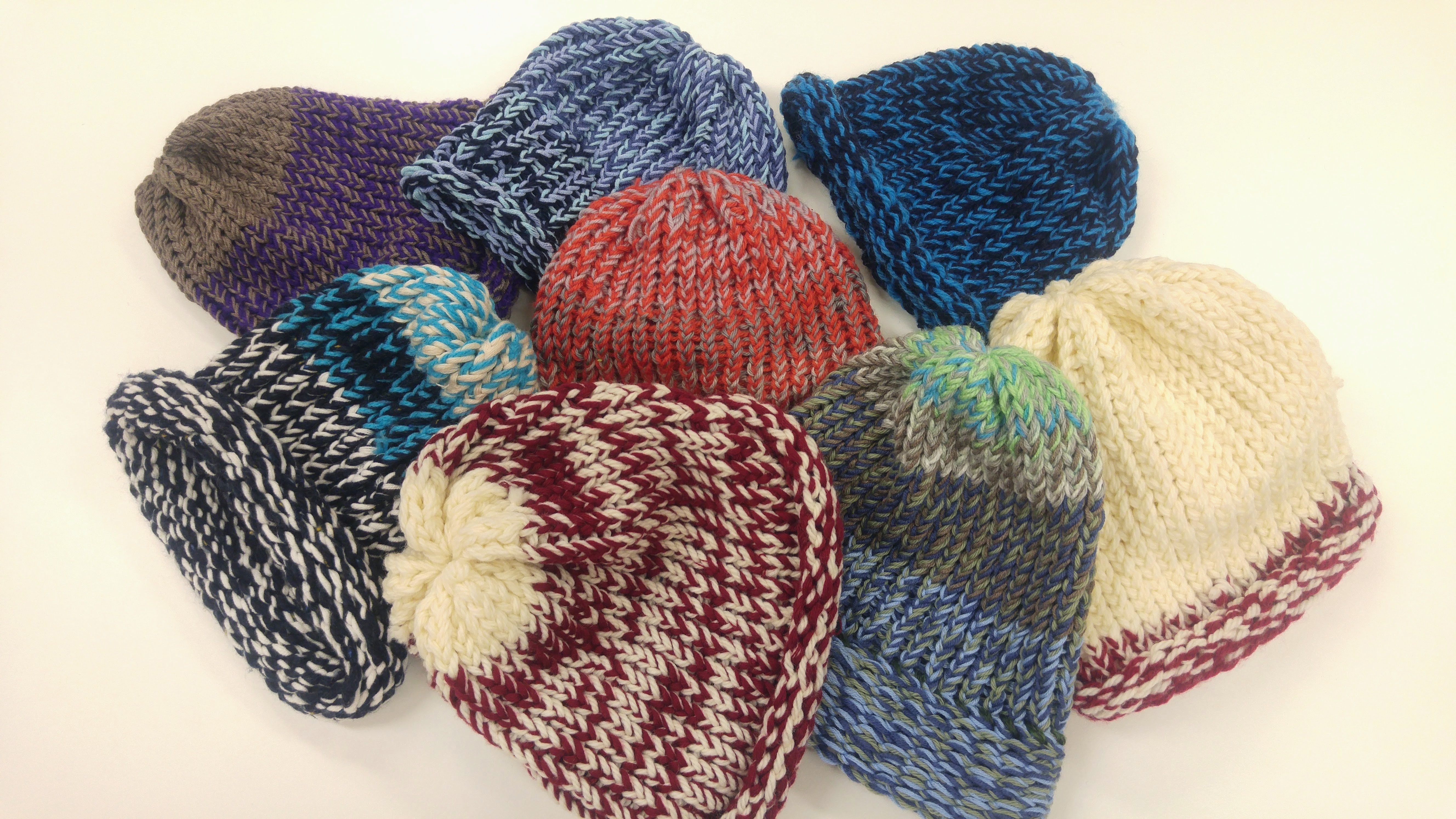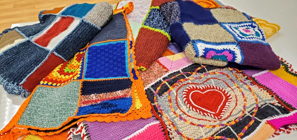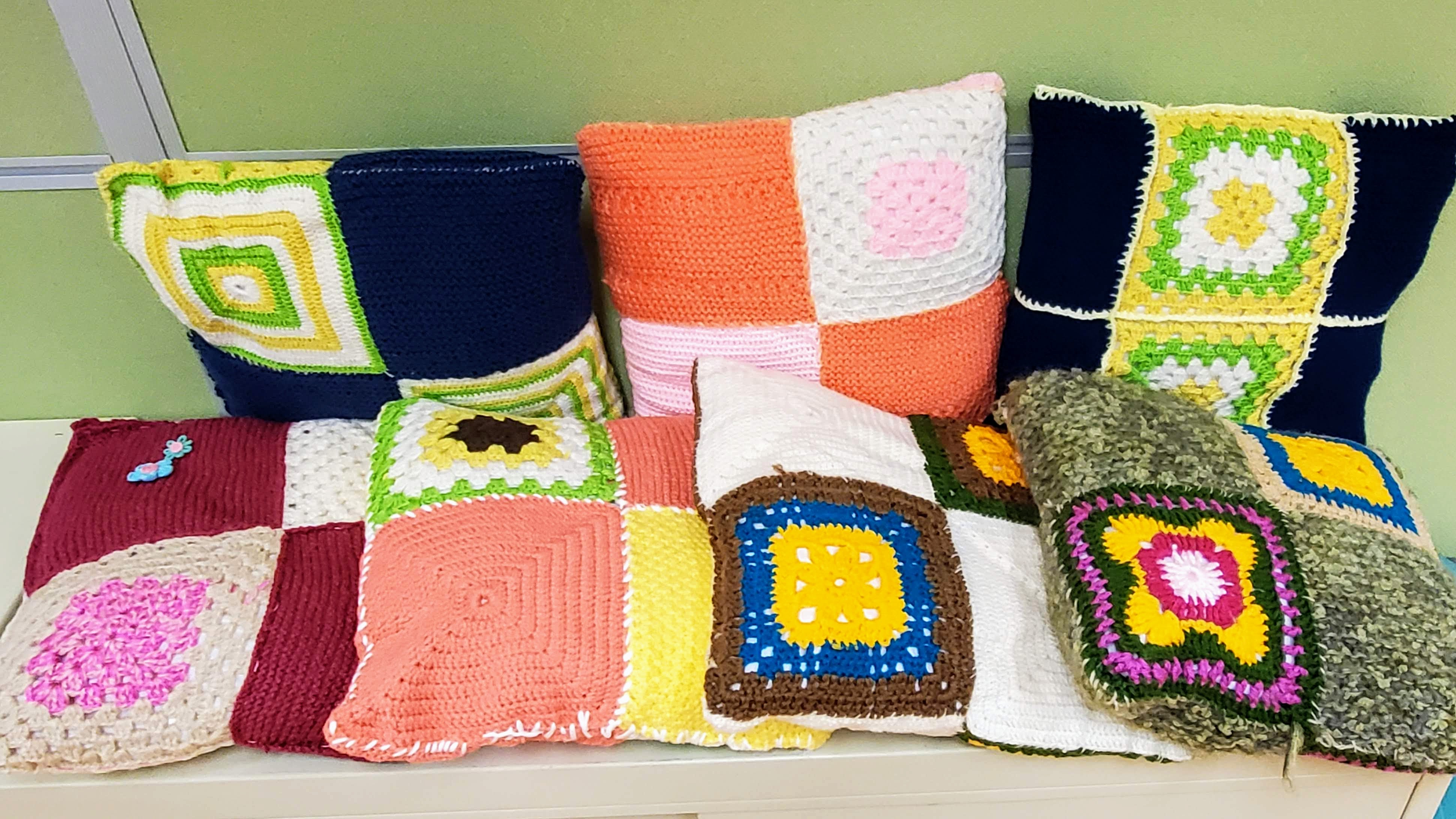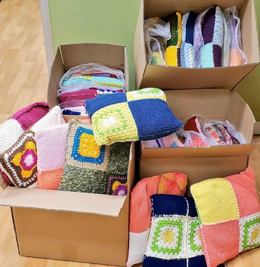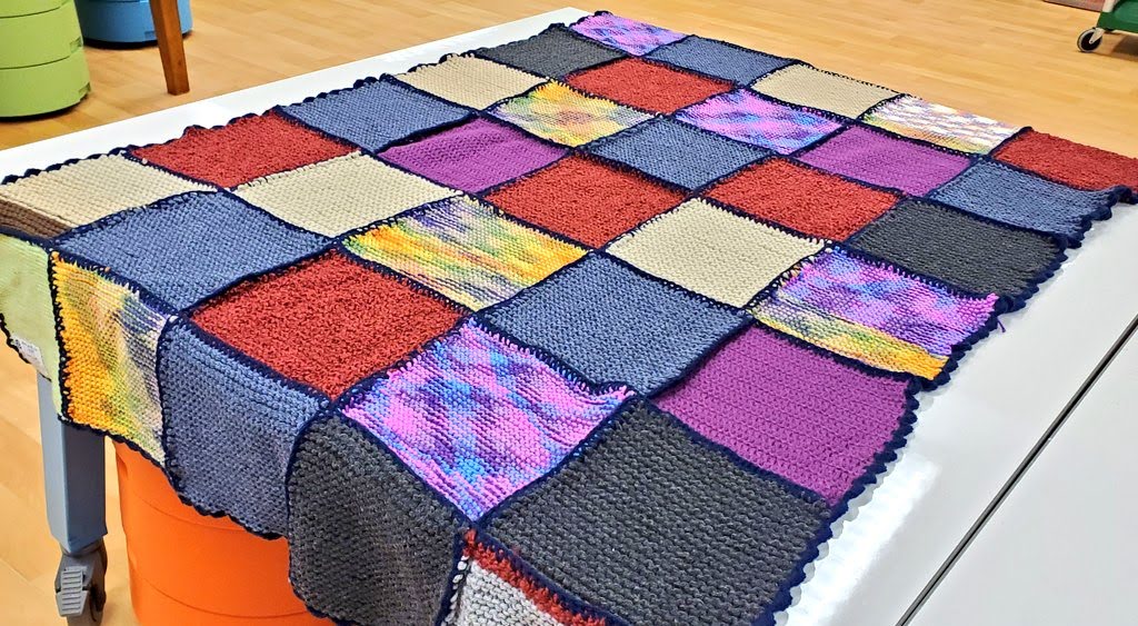 Working with younger students one year, the blanket activity was easily changed to cushions. With the leftover knitted squares, parents and staff volunteers stitched up the two sides of the cushion cover leaving one side free. Students stuffed and helped sew close the last side. These cushions were donated to a local refugee centre.