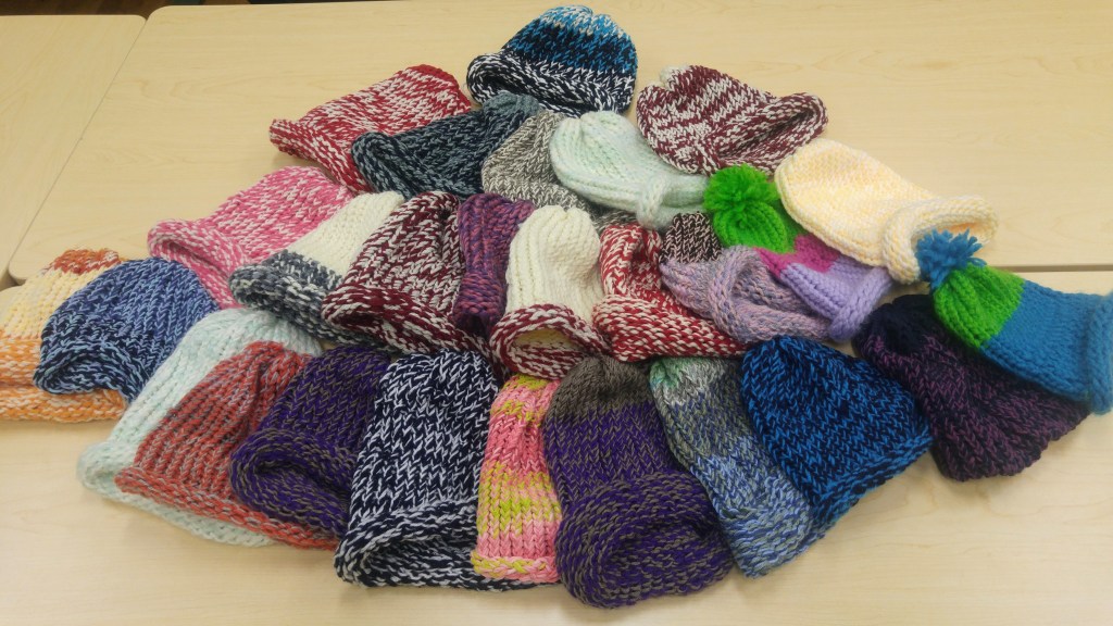This is a project which has been well supported by parents and is truly a community effort. It started with inviting the school community to knit a square (8″ X 8″) in any colour, pattern, or yarn. A group of parent volunteers were organized to stitch 40 pieces together to form a blanket. Other parents helped run the lunch time knitting sessions to teach interested students the craft (let’s be honest…as much as the younger ones want to help and learn; this is much more suitable for the older ones). Blankets were then donated to local elderly care centres as holiday gifts. I have been amazed by parents telling me how their grannies and aunties living in other countries, have been knitting year round, and then waiting for summer holidays to pass the completed squares to their grandchildren to take back to school. It is particularly warming to see how one project has touched three generations of a family.